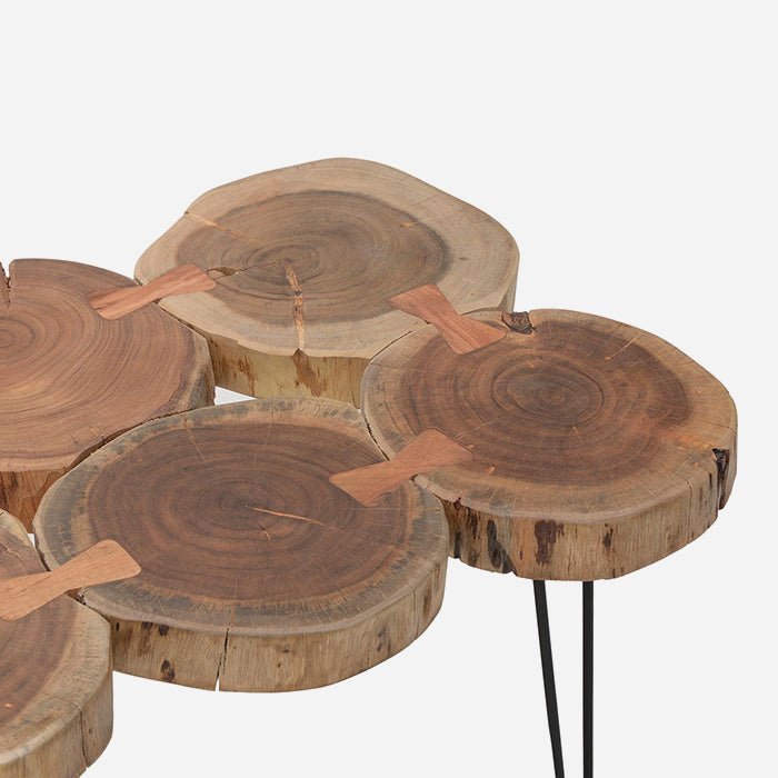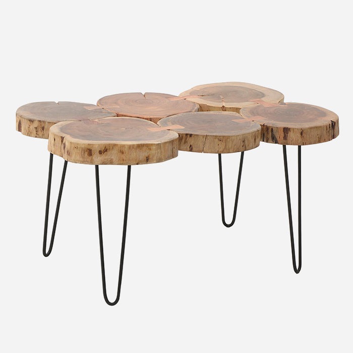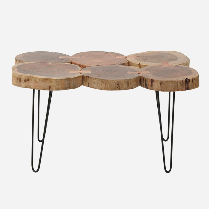 Käsintehty puinen ja metallinen sohvapöytä.